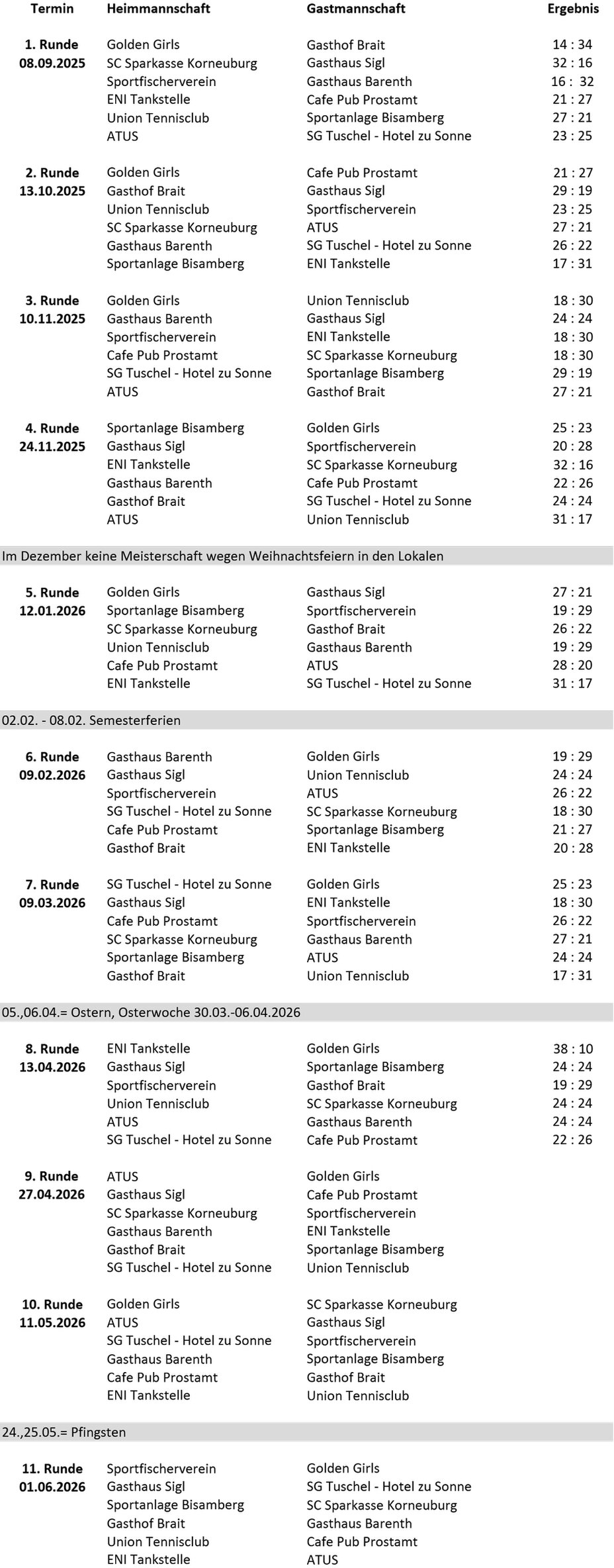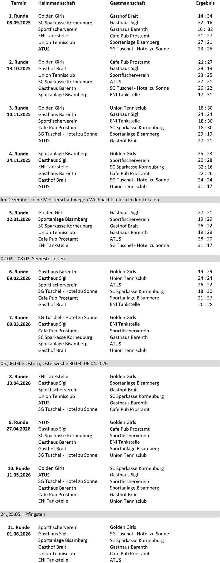 Spielplan - Korneuburger Schnapsermeisterschaften